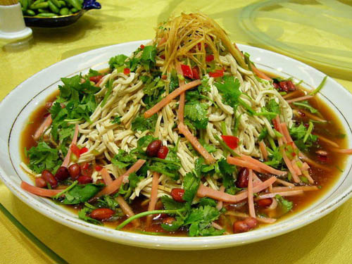 煮干絲:在乾隆時(shí)期名“九絲湯”,即干絲加火腿絲、筍絲、口蘑絲、木耳絲、銀魚絲、紫菜絲、蛋皮絲、雞絲,高檔的還要加海參絲或燕窩絲。