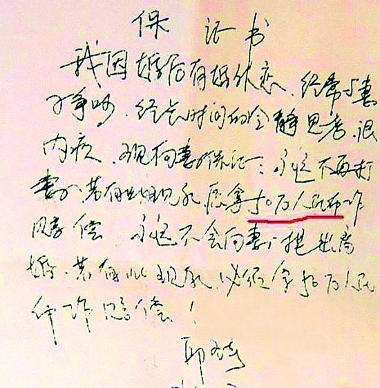 帖文稱,邱在結(jié)婚后有多次婚外情,在被發(fā)現(xiàn)后,曾經(jīng)保證不再與其他女性有不正當(dāng)關(guān)系,并先后兩次寫(xiě)下保證書(shū)。保證書(shū)寫(xiě)道,“我因婚后有婚外戀,經(jīng)常與妻子爭(zhēng)吵,經(jīng)長(zhǎng)時(shí)間的冷靜思考,很內(nèi)疚,特向妻子保證,永遠(yuǎn)不再打妻子,永遠(yuǎn)不會(huì)向妻子提出離婚,若有此現(xiàn)象,愿拿50萬(wàn)元作為賠償。”