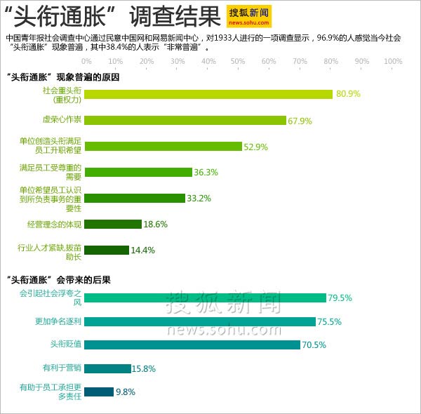 “頭銜通脹”現(xiàn)象普遍的原因有哪些?調(diào)查中,80.9%的人首選“社會重頭銜,其實(shí)就是重權(quán)力”,其次是“虛榮心作祟”(67.9%),52.9%的人選擇“單位創(chuàng)造頭銜滿足員工升職希望”。